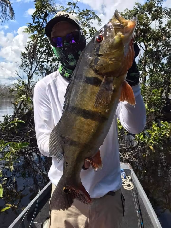 Peacock Bass är kända för sina explosiva hugg och enorma styrka. De är skapade för sportfiske. Den största arten, Giant Three-Barred Peacock Bass (Cichla temensis), finns i Brasilien, Colombia och Venezuela och kan väga runt 15 kg. Under sin livscykel går den från prickig ungfisk till en mäktig vuxen fisk med tre svarta ränder och en kraftfull orangebrun kropp.